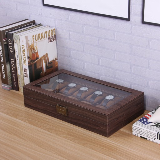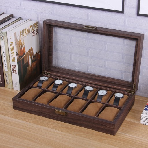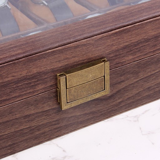 Solidne, eleganckie pudełko na 12 zegarków. Wykończone okleiną imitującą drewno. Można w nim przechowywać zegarki lub po wyjęciu poduszeczki biżuterię lub inne drobiazgi. Szkatułka idealnie nadaje się na prezent. Pudełko na zegarki jest niezwykle praktyczne i doskonale chroni zegarki przed kurzem i zarysowaniami.