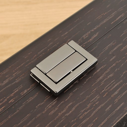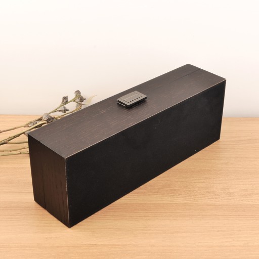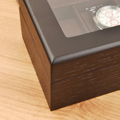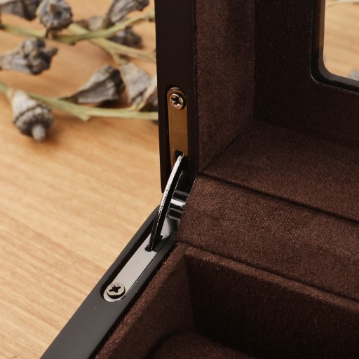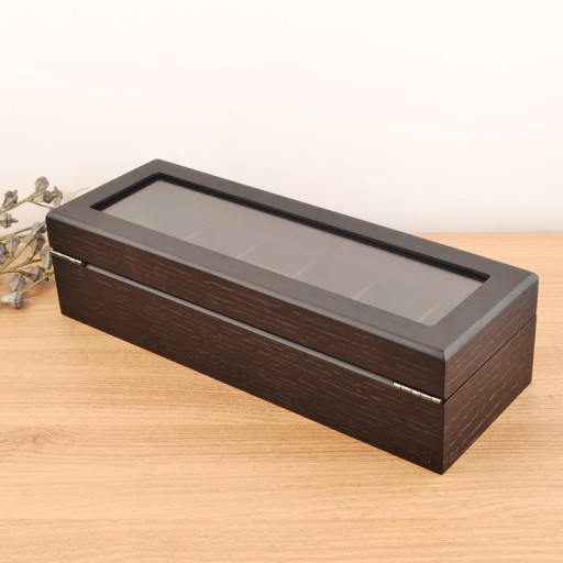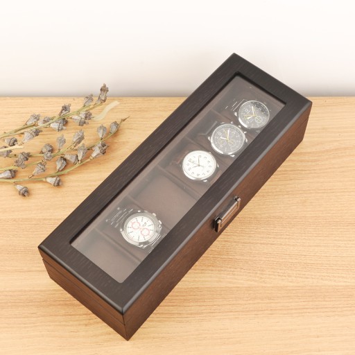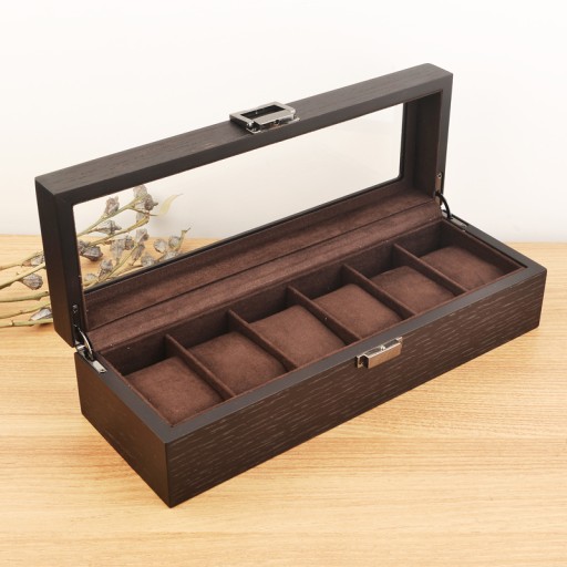 Wykończone ciemną okleiną imitującą drewno. Można w nim przechowywać zegarki lub po wyjęciu poduszeczki biżuterię lub inne drobiazgi. Szkatułka idealnie nadaje się na prezent. Pudełko na zegarki jest niezwykle praktyczne i doskonale chroni zegarki przed kurzem i zarysowaniami.