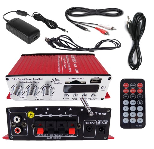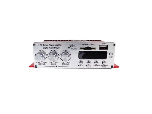 Wzmacniacz posiada wejście USB i SD dzięki czemu odtwarzać możemy pliki z muzyką w formacie mp3.