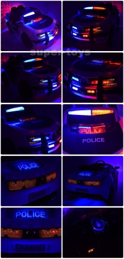 Tak, światła przednie i tylne działają już po uruchomieniu pojazdu, migające LEDY, podświetlana deska. Odgłosy policyjne KOGUTY - załączane osobnym włącznikiem w kierownicy.