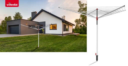 Podmuchy wiatru wprawiają suszarkę zewnętrzna Vileda w ruch obrotowy co w połączeniu z szerokim rozstawieniem linek, na których powieszone jest pranie sprawia, że pranie schnie szybciej.