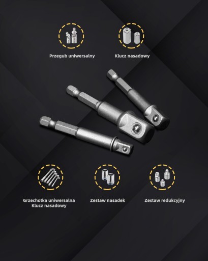 Zestaw specjalistycznych redukcji, adapterów do wkrętarki. Redukcje możliwości na pracę wkrętarką z nasadkami. Elementy zestawu są ze stali, które zapewniają ich trwałość i funkcjonalność.