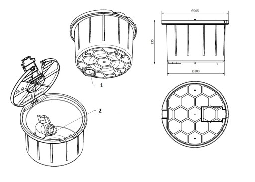 Studzienka poboru wody jest to pojemnik z tworzywa sztucznego z pokrywą zamontowaną na zawias. Wewnątrz studzienki został umieszczony metalowy zawór kulowy. Zawór posiada przyłącze gwintowane 3/4 cala na wlocie jak i wylocie. Studzienkę należy zamontować na równi z gruntem, tak aby było możliwe otwarcie pokrywy. Zaleca się podłączenie studzienki w wodę, wykonać za pomocą kolana PE GZ 3/4 cala.