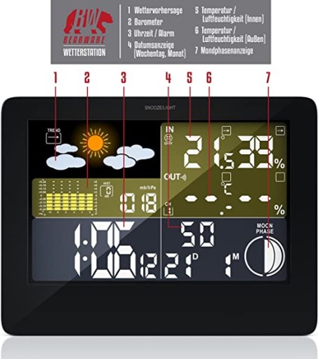 - Zastosowanie: Niezależnie od tego, jaka będzie pogoda, czy mocno lub lekko zachmurzone niebo, słonecznie, deszczowo lub pada śnieg – jeden rzut oka na duży, kolorowy wyświetlacz 14,6 cm (5,75”) stylowej stacji pogodowej Bearware wystarcza, aby uzyskać szczegółowy obraz aktualnych i przyszłych warunków pogodowych oraz wielu innych danych.