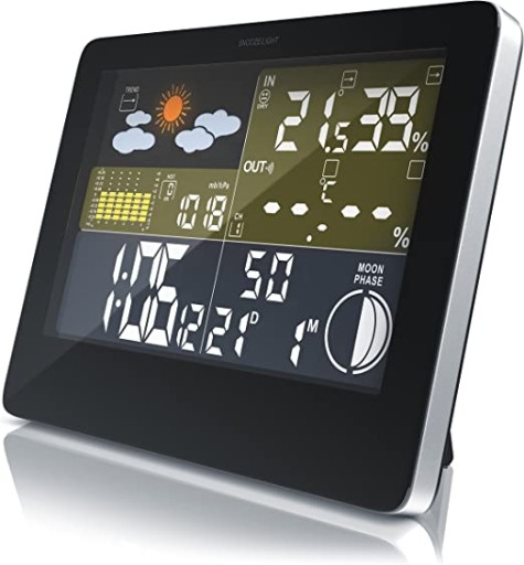 - Oznaczenie modelu: Bearware – stacja pogodowa z kolorowym wyświetlaczem o przekątnej 14,6 cm (5,75’’); w zestawie zasilacz z wtyczką 3,5 mm; wygodna transmisja bezprzewodowa; funkcje:sygnał DCF, wskaźnik daty, funkcja alarmu (budzika), temperatura wewnętrzna i zewnętrzna, czujnik zewnętrzny, wskaźnik temperatury, wskaźnik wilgotności powietrza, wskaźnik ciśnienia powietrza, piktogram prognozy pogody, funkcja drzemki, format czasu 12/24-godzinny, wskaźnik fazy księżyca,