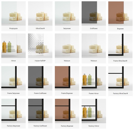 Istnieje możliwość zakupienia drzwi w szkle innym niż przejrzyste - poniżej dostępne warianty: