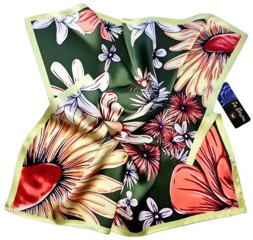Przepiękna jedwabna chusta, marki LaDorena® wykonana z najwyższej jakości naturalnej ciężkiej satyny jedwabnej o rzadko dostępnej grubości aż 12 M/m, Wymiary 55x55 cm. Chusta zachwyci każdą elegancką kobietę.
