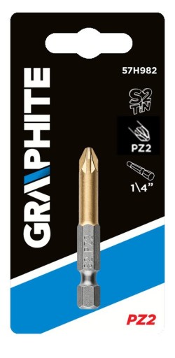 Końcówka wkrętakowa GRAPHITE (nr ref. 57H982) typu PZ2, przeznaczona do wkręcania/wykręcania wkrętów i śrub z łbem typu Pozidrive o rozmiarze 2 mm. Pokrycie powierzchni końcówki azotkiem tytanu (złoty kolor) znacząco przedłuża żywotność narzędzia poprzez utwardzenie punktu styku z łbem śruby. Zwiększona długość końcówki pozwala na zastosowanie narzędzia do śrub i wkrętów umieszczonych w głębokich gniazdach