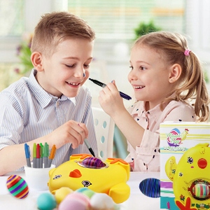 [Unikalny kształt ramy dostosowującej dekorację jajka wielkanocnego]: Nasza maszyna do samodzielnego tworzenia jajek wielkanocnych ma unikalny kształt i jest magicznym jajkiem. Nasz zestaw do dekoracji pisanek zawiera talerz obrotowy do jajek, 8 kolorowych szybkoschnących markerów, 3 plastikowe jajka-zabawki, 3 drewniane jajka i 4 naklejki. Maszyna do farbowania jajek to doskonała zabawka, która pozwoli dzieciom wykazać się kreatywnością, jednocześnie poprawiając zdolności motoryczne.