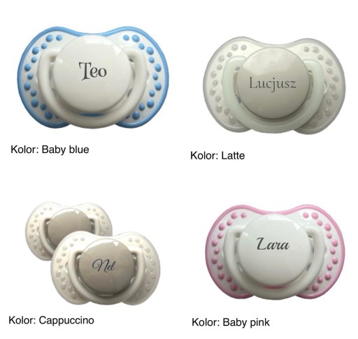 Smoczki 6-18m dostępne w kolorach: baby-blue, baby-pink, cappucinno, jasny róż, brudny róż, kremowy, pastelowa zieleń, stalowy niebieski, toffi, niebieski, biało czarny i szary