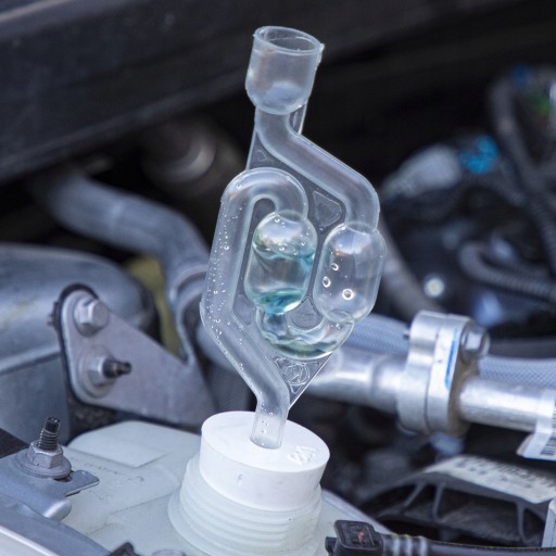 - Obserwuj bąbelkujący płyn reakcyjny. Zabarwienie płynu reakcyjnego na kolor żółty lub zielony wskazuje na uszkodzenie uszczelki pod głowicą lub uszkodzenie głowicy.