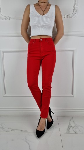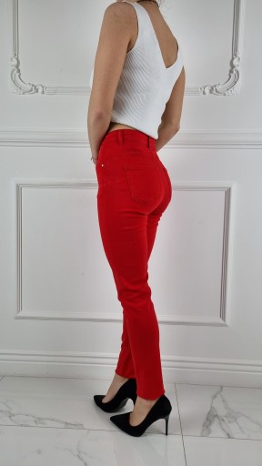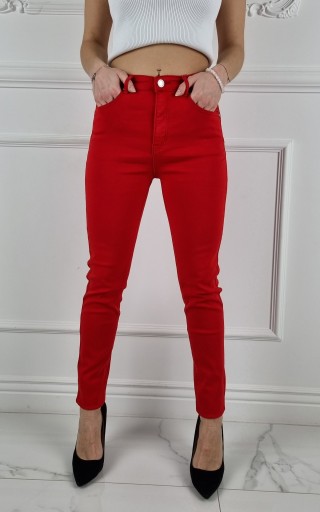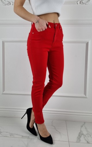 Świetne spodnie w kolorze czerwonym posiadają wysoki stan. Świetne do sportowego obuwia ale idealnie też sprawdzą się w połączeniu ze szpilkami, dzięki swojej uniwersalności, pasują niemal do każdej stylizacji. Elastyczny materiał podkreśla kobiecą sylwetkę. Spodnie są dopasowane, rozciągają się. Podkreśl swoje kobiece kształty! Spraw, by Twój codzienny Look był niepowtarzalny. Spodnie po obu stronach posiadają kieszenie.