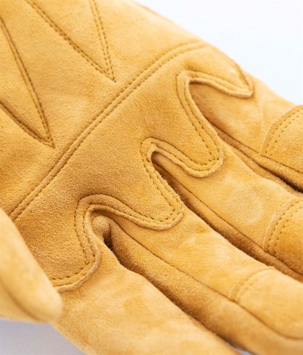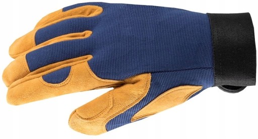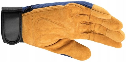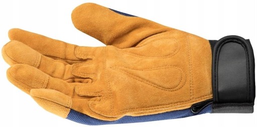 ► Rękawice kombinowane: dłoń z dwoiny bydlęcej, grzbiet z niebieskiego poliestru i elastyny, wyściółka w dłoni eliminująca odciski.