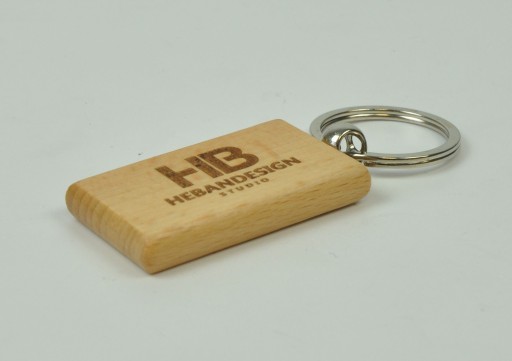 Drewniane breloki do kluczy z jednostronnym grawerem. Każdy brelok ma metalowy pierścień i jest wykonany z jasnego, gładkiego drewna. Grawer jest ciemny i kontrastuje z jasnym drewnem.