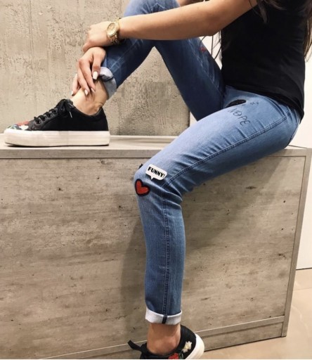 Jeansowe legginsy Calzedonia , z gumką w pasie, bez zamków i guzików, z prawdziwymi tylnymi kieszeniami. Cekinowe naszywki podążają za najnowszymi trendami.