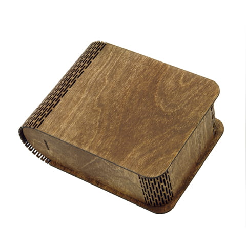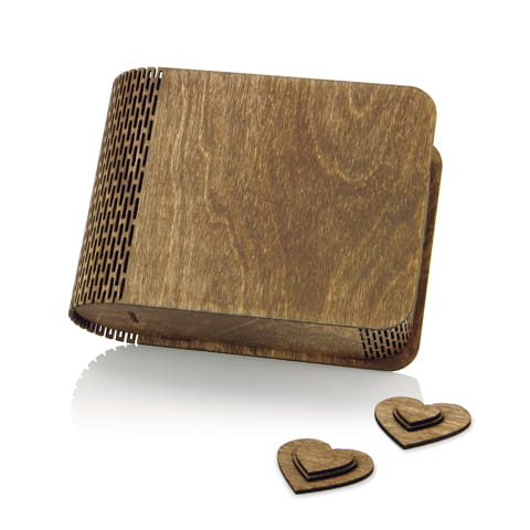 Pudełko jest wykonane w całości z drewna brzozowego, szlifowanego, a następnie bejcowanego w kolorze dębu rustykalnego. Powierzchnia została dodatkowo zabezpieczona naturalnym olejem. Dzięki specjalnym nacięciom na grzbiecie oraz magnesom, pudełko jest wygodne i praktyczne w użytkowaniu.