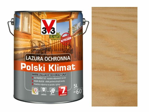 Lazura V33 BEZBARWNY 5L zapewnia skuteczną ochronę drewna narażonego na trudne warunki atmosferyczne – nawet do 7 lat! Filtr UV Protect 35 zabezpiecza drewno przed promieniowaniem słonecznym do 35 razy dłużej niż produkty bez filtra.Przeznaczenie: Drewno zewnętrzne narażone na działanie promieni UV i niekorzystnych warunków atmosferycznych: elewacje drewniane, płoty, okna, drzwi, belki, domki narzędziowe, meble ogrodowe, pergole itp. Wszystkie gatunki drewna z wyłączeniem drewna tłustego oraz zawierającego antyoksydanty. Na powierzchnie umożliwiające swobodny spływ wody i śniegu.Właściwości: Zapewnia ochronę drewna do 7 lat Impregnuje drewno, wnikając w jego głąb UV PROTECT 35 – filtry UV i pigmenty skutecznie blokują promienie słoneczne – do 35 razy dłużej niż w przypadku produktów bez filtra. AQUA BLOCK – hydrofobowa formuła sprawia, że krople wody nie wnikają w głąb drewna, a spływają po jego powierzchni Mrozoodporna, nie pęka oraz nie łuszczy się pod wpływem niskich temperatur Elastyczna, niełuszcząca się powłoka pracuje wraz z drewnem podczas zmian wilgotnościowych Powłoka jest odporna na działanie grzybów i glonów Utrwala piękno drewna i podkreśla jego usłojenie.