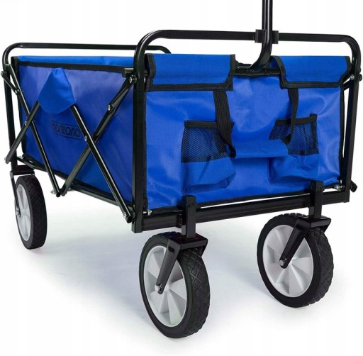 Wózek wykonany jest z metalowej ramy oraz wodoodpornego materiału. Posiada wygodny i szeroki uchwyt, dzięki antypoślizgowej rączce transport nie sprawi Ci najmniejszego problemu.