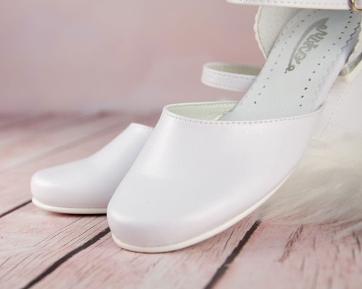 Klasyczne, białe buty komunijne dla dziewczynki, zapinane na regulowany paseczek ze sprzączką. Buciki dobrze wyprofilowane, dzięki czemu pewnie trzymają się stopy. Model na delikatnym obcasiku o wysokości 1,5 cm, w kolorze srebrnym. Eleganckie i gładkie buty będą pasować do każdej sukieneczki. Zewnętrzna część obuwia wykonana jest ze skóry ekologicznej, natomiast zapiętek i wkładka ze skóry naturalnej.