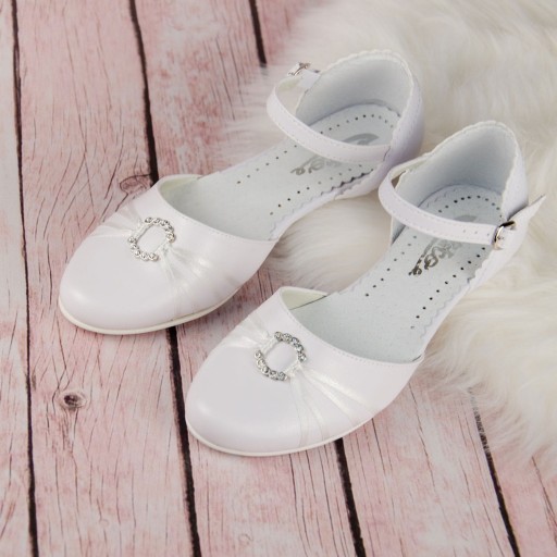 Eleganckie białe buty komunijne dla dziewczynki. Fason z zapiętkiem i regulowanym paseczkiem. Buciki dobrze wyprofilowane, dzięki czemu są bardzo wygodne. Model na delikatnym obcasiku o wysokości 2,5 cm, w kolorze białym. Uroku dodają mu ozdoba z cyrkoniami przymocowana na cienkich wstążeczkach. Klasyczny model, który będzie pasował do większości sukienek lub alb. Zewnętrzna część obuwia wykonana jest ze skóry ekologicznej, natomiast zapiętek i wkładka ze skóry naturalnej.