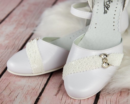 Eleganckie białe buty komunijne dla dziewczynki. Fason z zapiętkiem i regulowanym paseczkiem. Buciki dobrze wyprofilowane, dzięki czemu są bardzo wygodne. Model na delikatnym obcasiku o wysokości 2,5 cm, w kolorze białym. Uroku dodają mu wstawka przyozdobiona malutkimi koralikami, ze srebrną ozdobą. Klasyczny model, który będzie pasował do większości sukienek lub alb. Zewnętrzna część obuwia wykonana jest ze skóry ekologicznej, natomiast zapiętek i wkładka ze skóry naturalnej.