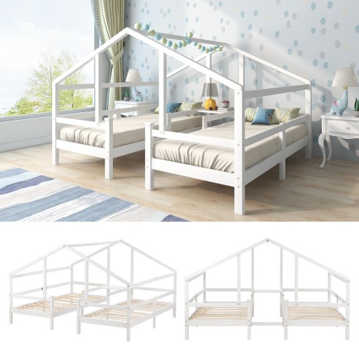 Łóżko domek dla dzieci 2, dwa pojedyncze łóżka pod jednym dachem w konstrukcji łóżka domowego ze stolikiem nocnym i ramą z listew, łóżko młodzieżowe 90 * 200 z zabezpieczeniem przed upadkiem, białe