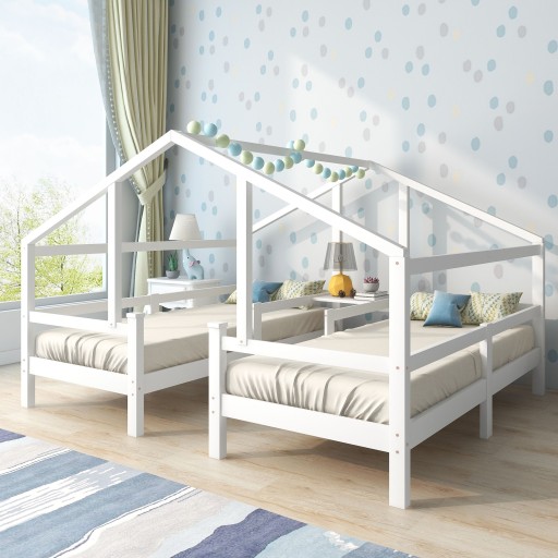 [Styl skandynawski] Masz dwójkę dzieci w pokoju dziecięcym, ale nie chcesz łóżka piętrowego, bo są dość ruchliwe? W takim razie łóżko domek dla 2 dzieci jest w sam raz! To podwójne łóżko domek o wymiarach 244 x 207 cm (dł. x szer.) składa się z dwóch pojedynczych łóżek pod jednym dachem. Łóżko domek oferuje dwa bezpieczne i wygodne miejsca do spania, a jednocześnie zaprasza do snu i zabawy.