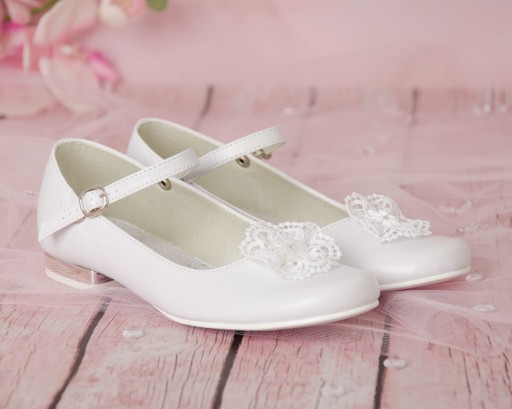 Eleganckie, wsuwane białe buty komunijne dla dziewczynki. Buciki dobrze wyprofilowane, dzięki czemu pewnie trzymają się stopy. Dodatkowo posiadają paseczek, którego można użyć z przodu dla lepszego utrzymania stopy lub z tyłu jako ozdobę. Model na delikatnym obcasiku o wysokości 1,5 cm, w kolorze srebrnym. Uroku dodaje im piękny kwiat. Zewnętrzna część obuwia wykonana jest ze skóry ekologicznej, natomiast wkładka ze skóry naturalnej. Klasyczne baleriny idealnie sprawdzą się zarówno w dniu Pierwszej Komunii Świętej jak i w podczas innych uroczystości i nie tylko.