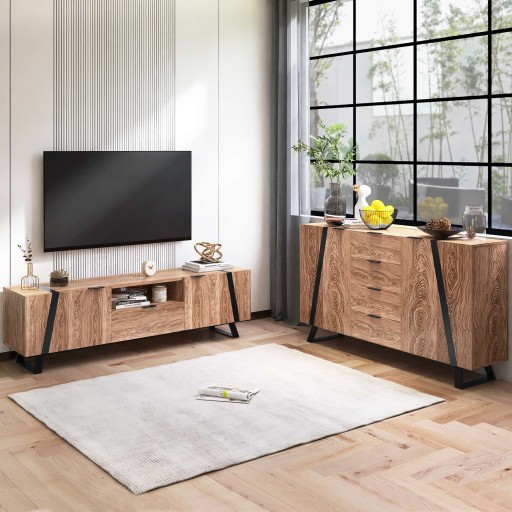 Kredens z wzorem drewna, powierzchnia płyty wiórowej z czarnym sitodrukiem, z 2 drzwiami 4 szufladami 6 uchwytami, nowoczesna komoda Szafka boczna Salon Sypialnia, 160*35*85cm