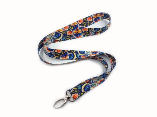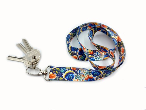 Smycz z nadrukiem w kolorowe kwiaty w stylu folkowym o szerokości 20mm z metalowym srebrnym karabińczykiem do kluczy