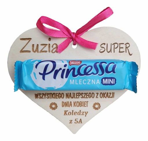 Serce drewniane z okazji Dnia Kobiet w zestawie z batonem.