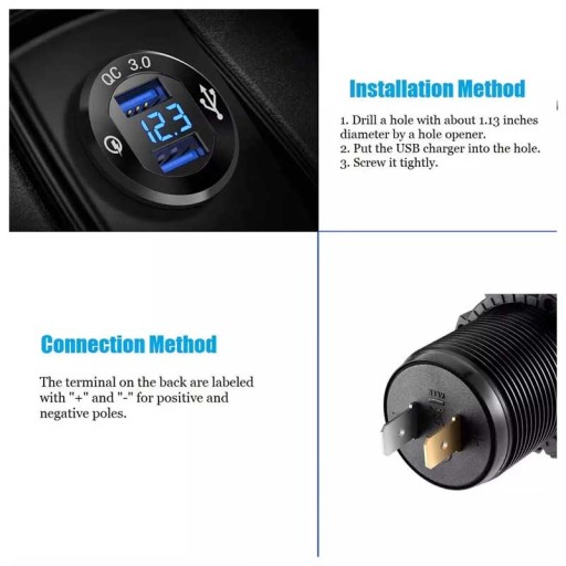 Woltomierz do łodzi z dwoma gniazdami USB A. Szybkie ładowanie QC 3.0, łatwy montaż, podświetlenie Led na kolor niebieski. W komplecie wiązka łączeniowa z bezpiecznikiem.