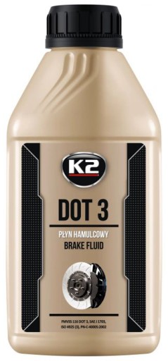 K2 DOT 3 to nowoczesny płyn hamulcowy stosowany w układach hamulcowych i sprzęgłowych. Temperatura wrzenia płynu hamulcowego DOT 3 znacznie przekracza wymagalną normami temperaturę 205 C. Zapewnia doskonałą ochronę przed korozją i zabezpiecza elementy gumowe. Wydłuża żytowność układu hamulcowego.