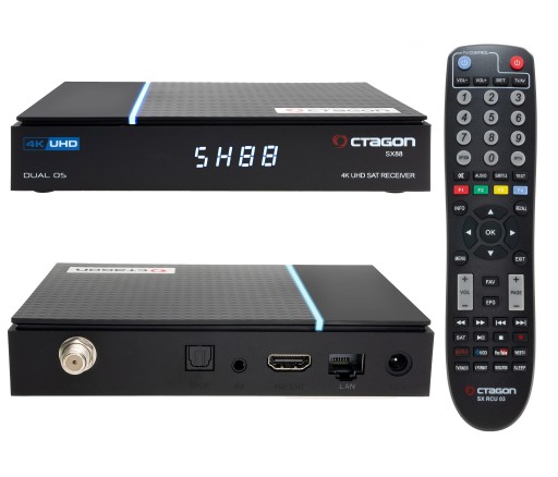 Najnowsza wersja (V2) znanego i cenionego u nas odbiornika Octagon SX88. Tym razem to odbiornik 4K z podwójnym systemem operacyjnym (Dual OS): klasycznym znanym z modeli SX88 Define OS oraz Linux typu ENIGMA2. Ten drugi dzięki oprogramowaniu OpenATV 7.2 daje użytkownikowi jak zwykle w takim przypadku nieograniczone możliwości oparte na dodatkowych rozszerzeniach, wtyczkach, które można pobierać z Internetu. Sercem odbiornika jest procesor Huawei Hisilicon Hi3798MV300 taktowany zegarem 4x1500 MHz. Posiada 4GB pamięci Flash i 1GB pamięci RAM. Ma jedno wejście SAT do podłączenia anteny satelitarnej, 2 wejście USB, gniazdo LAN do podłączenia do Internetu i Uniwersalny czytnik kart.