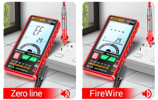 umieść czujnik NCV bliżej mierzonego kabla, analogowy wskaźnik słupkowy wzrasta po wykryciu pobliskiego napięcia przemiennego, ekran pokazuje "EF", I zabrzmi sygnał dźwiękowy.