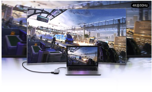 Podłącz adapter wszędzie tam gdzie chcesz. Dzięki wyjściu obrazu pracującemu w standardzie HDMI 1.4b do 2.0 podłączysz swój komputer do telewizora, projektora lub monitora. Hub obsługuje odświeżanie obrazu w 30Hz.