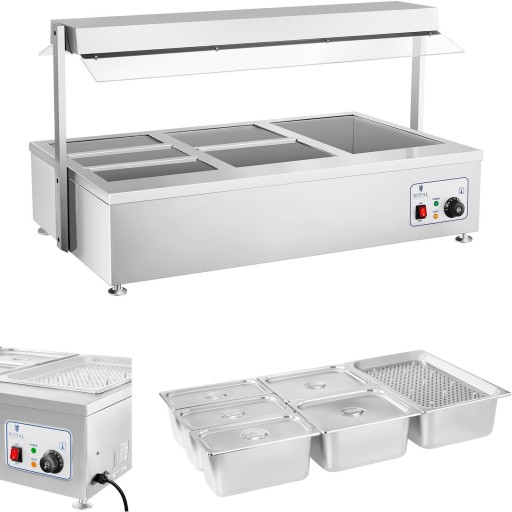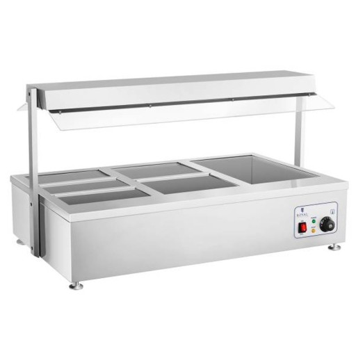 Profesjonalny bemar marki Royal Catering to niezawodny produkt, którego nie powinno zabraknąć na wyposażeniu żadnego hotelu, restauracji, baru szybkiej obsługi, kantyny czy bufetu. Sprzęt umożliwiający suche podgrzewanie i utrzymywanie optymalnej temperatury dań i przekąsek dysponuje wydajnym elementem grzewczym oraz lampą halogenową z trzema żarówkami. 6 pojemników GN pozwala serwować spore ilości potraw i przekąsek, np. ziemniaków, mięs, wędlin, sosów, zup, gulaszy, ryżu