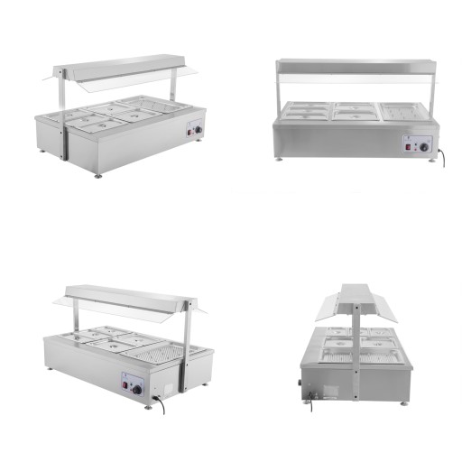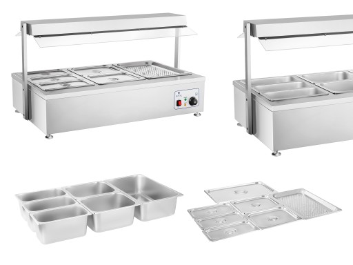 Profesjonalny bemar to wydajne, solidne i bardzo łatwe w obsłudze urządzenie gastronomiczne. Dysponuje elementem grzewczym, a także lampą halogenową służącymi do podgrzewania na sucho i utrzymywania temperatury zup, sosów, ryżu, mięs, ziemniaków, wędlin, gulaszów itp. Produkt wyposażony w 6 pojemników GN świetnie spisuje m.in. w hotelach, barach szybkiej obsługi, restauracjach, kantynach, bufetach, a także podczas kolonii, obozów lub eventów