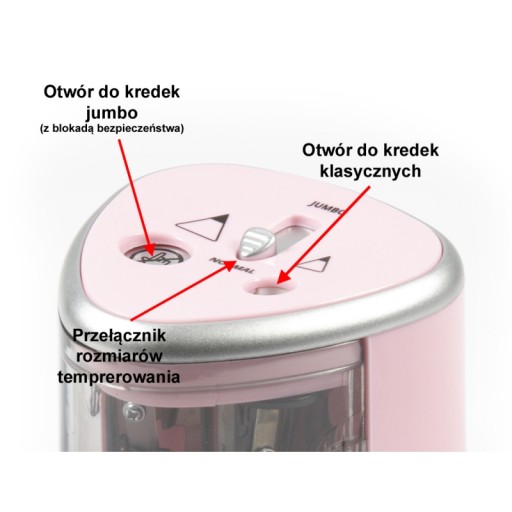 Idealna do szybkiego ostrzenia ołówków i kredek w dwóch grubościach. Jest funkcjonalna, bezpieczna w użyciu i poręczna. W temperówce zamontowano czujnik bezpieczeństwa, dzięki któremu temperówka nie będzie ostrzyć, gdy wyciągniemy pojemnik na strużyny (wymaga użycia 4 baterii AA 1,5 V).