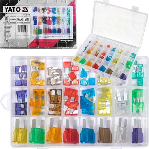 Zestaw marki YATO zawierający 88 sztuk bezpieczników przeznaczonych m.in. do samochodów osobowych, kompresorów, pompek elektrycznych, prostowników, rozdzielaczy gniazd.