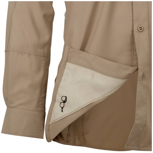 Materiał zabezpiecza przed promieniowaniem UV na poziomie UPF 30. Kołnierz z dodatkową patką można postawić, aby ochronić kark przed palącym słońcem, a łatwo podwijane rękawy oraz panele siatkowe pod pachami zapewnią ochłodę i wentylację, aby bez względu na charakter wyjazdu właściciel koszuli czuł się w niej naprawdę komfortowo. Zapinana jest na guziki przyszyte mocną taśmą.