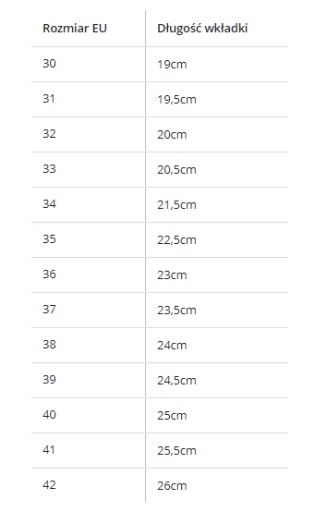 Przy wyborze rozmiaru proszę kierować się DŁUGOŚCIĄ WKŁADKI, rozmiarówka buta jest delikatnie zaniżona.