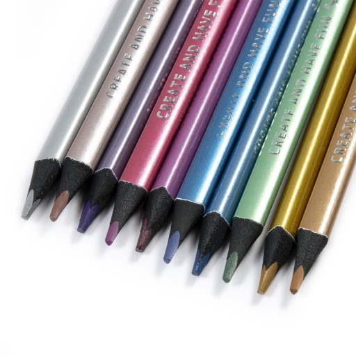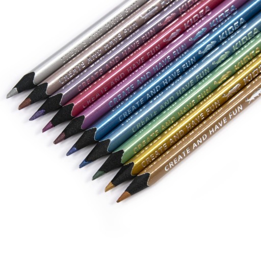 Zestaw 10 kredek w metalicznych kolorach. Rysunki kredkami metalicznymi osiągają najlepszy efekt na ciemnym papierze. Na czarnej kartce kolory zyskują wyraźniejszy połysk oraz nabierają intensywności. Ich ergonomiczny, trójkątny kształt ułatwia prawidłowy chwyt i wygodne użytkowanie.