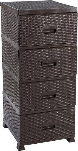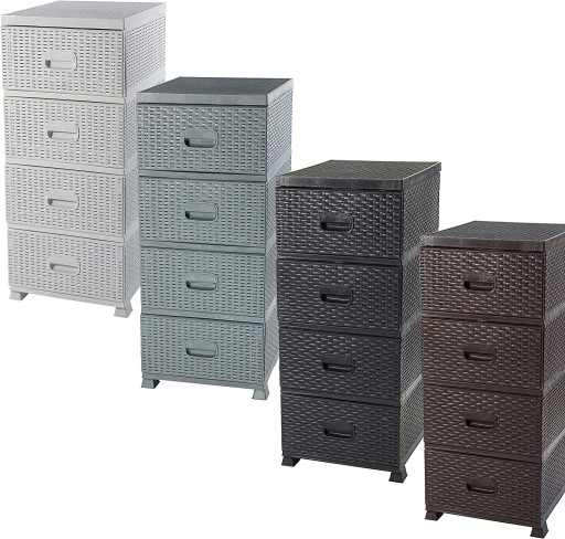Produkt składa się z 4 pojemników, które pełnią funkcję szuflad. Zostały wykonane z tworzywa sztucznego, ale swoim wyglądem przypominają rattanowe kosze. Dzięki temu prezentują się bardzo estetycznie.