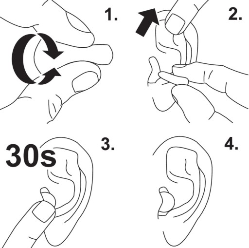 Rolując zatyczkę w dłoniach należy uformować ją w cylinder, a następnie wsunąć głęboko do ucha. Wsuniętą zatyczkę przytrzymać w kanale usznym przez około 30 sekund, aż do całkowitego rozprężenia. Przy pomocy palców lub w lustrze sprawdzić czy zatyczka została wsunięta do samego końca. Powinien być widoczny lub wyczuwalny tylko sam koniec zatyczki.