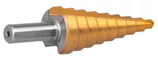 Wiertło stopniowe ze stali HSS powlekanej warstwą tytanu. Pozwala na wiercenie idealnie okrągłych otworów w stali, mosiądzu, miedzi, aluminium, drewnie i tworzywie sztucznym.