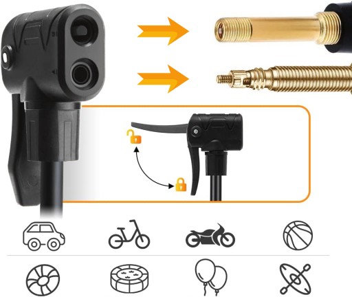 ⚫wyprowadzenie na 2 rodzaje wentyli: samochodowych oraz rowerowych.