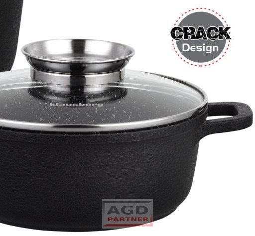 8 elementowy zestaw garnków z niezwykle trwałą powłoką granitową. Z zewnątrz pokryte powłoką o porowatej, spękanej strukturze Crack Design. Daje to ciekawy efekt wizualny. Wyposażony w pokrywki szklane z uchwytem Aroma Knob w którym umieszczono dozownik oleju, dzięki któremu podczas gotowania lub duszenia można podawać olej lub płynne przyprawy.