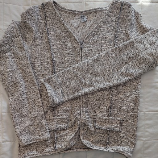 Nowy sweterek zapinany na zamek. Z uwagi na to, że towar jest outletowy ma wycięte metki :( . Rozmiar 170cm (15-16 lat). Wymiary na płasko : dł całkowita 55 cm, szerokość pod pachami 42,5 cm, dł wew rękawa 49 cm. Zapięcie: zamek