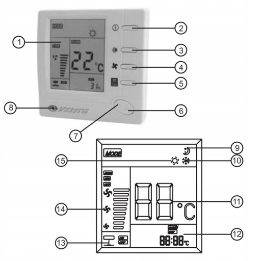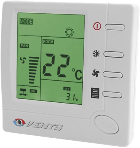 W obudowie panelu wykonanego z plastiku jest wbudowany czujnik temperatury. Na frontowej płycie pulpitu znajduje się wyświetlacz LCD z podświetleniem przycisku sterowania. Wyświetlacz wskazuje obecną oraz ustawioną temperaturę powietrza w pomieszczeniu, wybrany system (ochłodzenie, nagrzewanie) lub automatyczne ustawioną prędkość wentylatora. Prędkość wentylatora można ustawić ręcznie za pomocą przycisków sterowania. Istnieje możliwość sterowania trzema prędkościami (szybko, średnio/wolno) automatycznie w zależności od temperatury w pomieszczeniu.